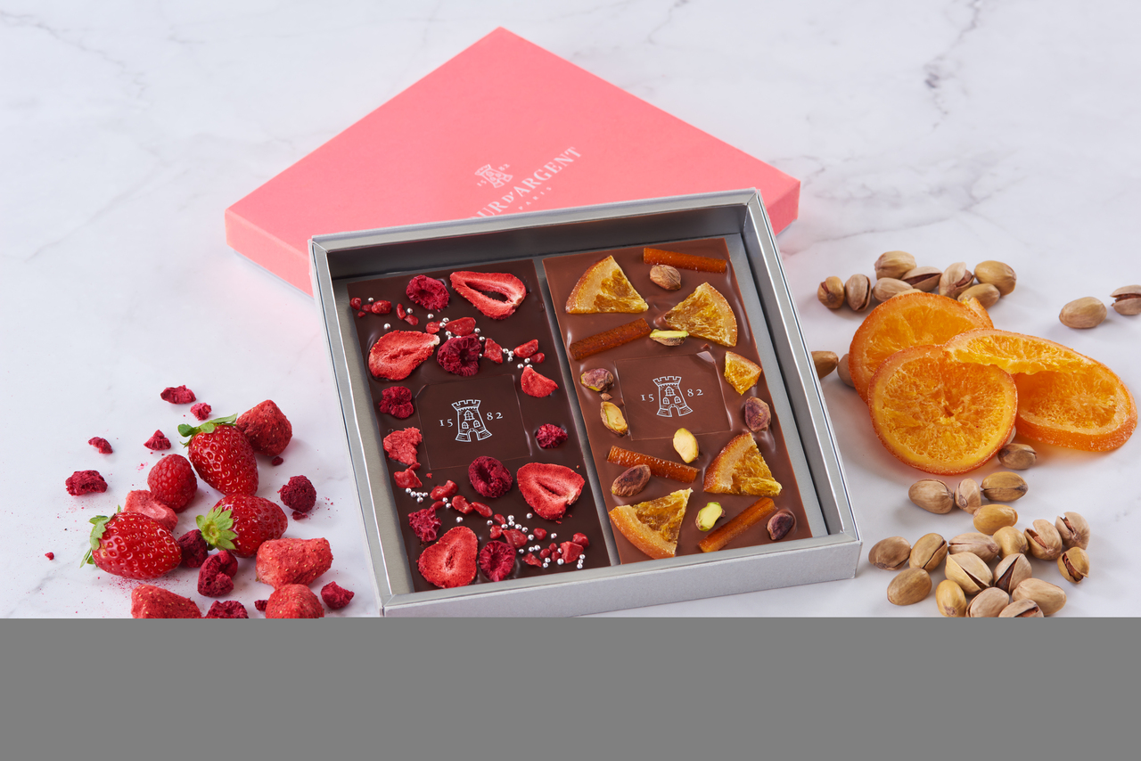 “パヴェ ドゥ パリ”は仏語で“パリの石畳”という意味。2種類の手作りオリジナルタブレットをセットにしました。マダガスカル産カカオ64%マンジャリにフリーズドライの苺とフランボワーズを散りばめたタブレットショコラとカカオ40%のショコラオレにセミドライオレンジとピスタチオをあしらったタブレット。