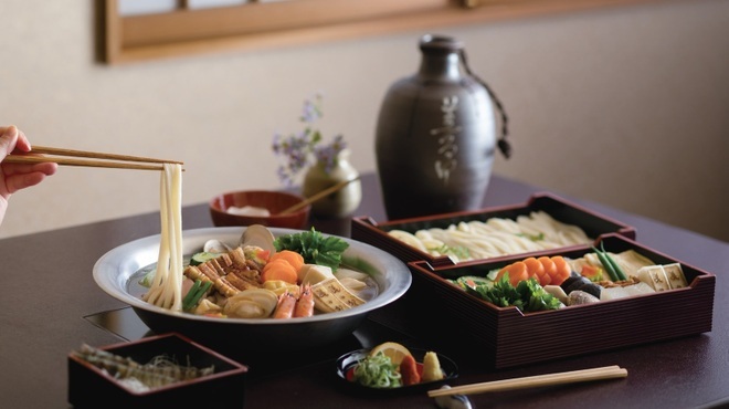 Enjoy the delicious flavors of the luxurious broth made from dried bonito flakes, honkarebushi and Rishiri kelp, the thick udon noodles which become softer the more they are simmered, and fresh seafood and mountain delicacies.
