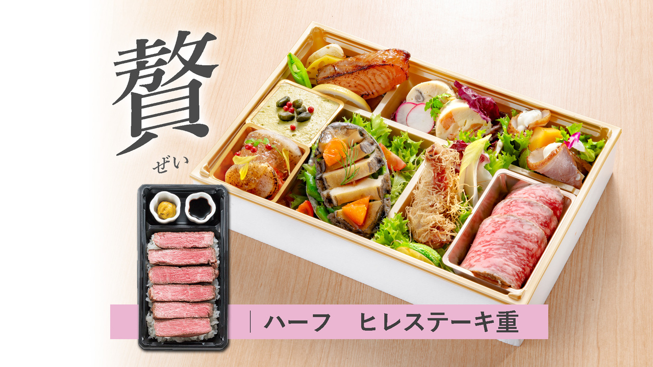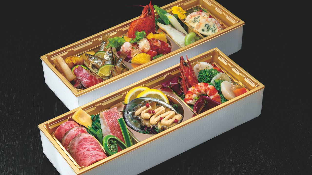 和牛・ズワイ蟹のお寿司からステーキ、フグの炙りなどの8種9品を豪華に盛り付けた特別弁当となっております。