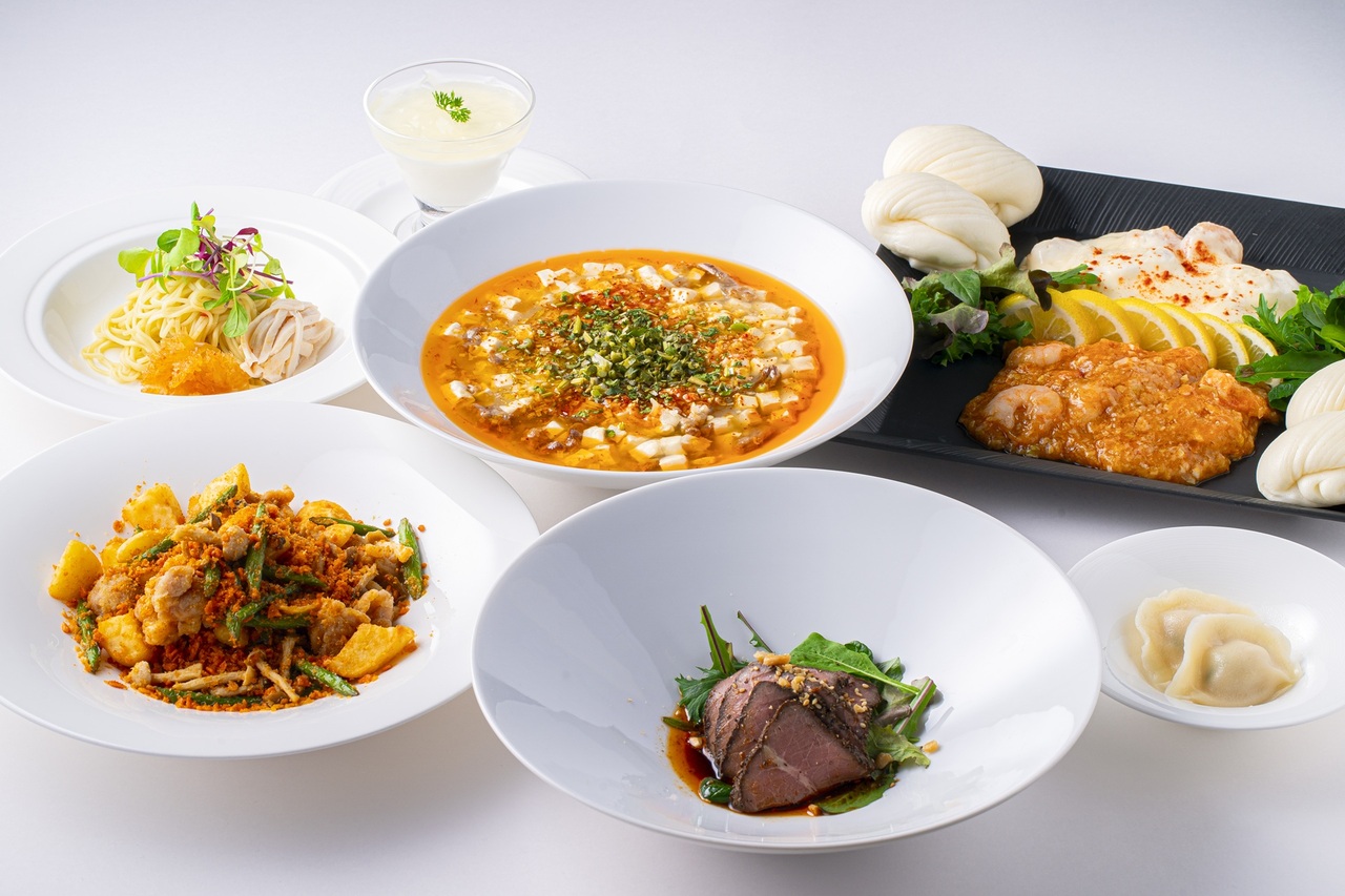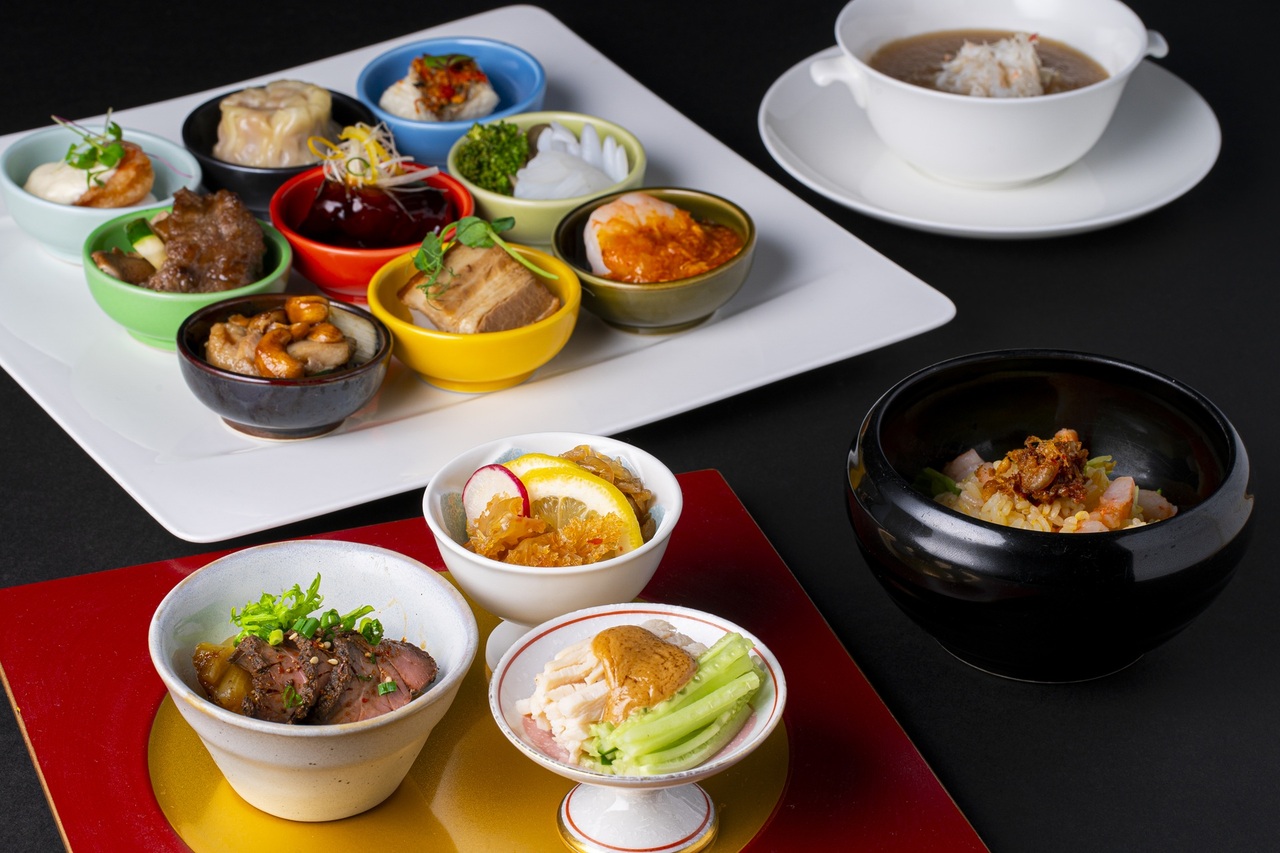 サラダ、点心2種、メイン2品、ご飯&スープ または お粥、デザート