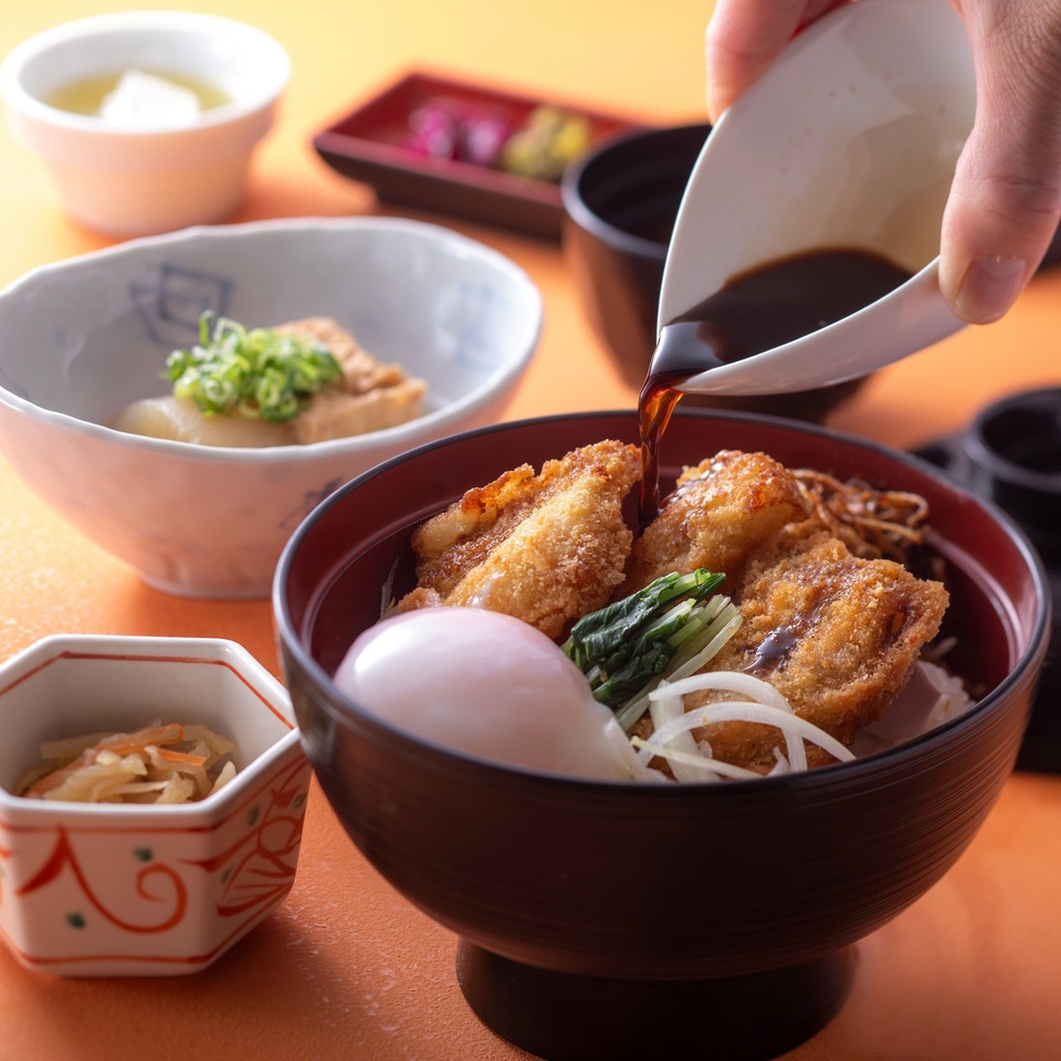 此照片僅供參考。根據原料供應情況,內容可能會有所變動。神戶醬豬排蓋飯、兩種關東煮、小菜、紅味噌湯、鹹菜、甜點。