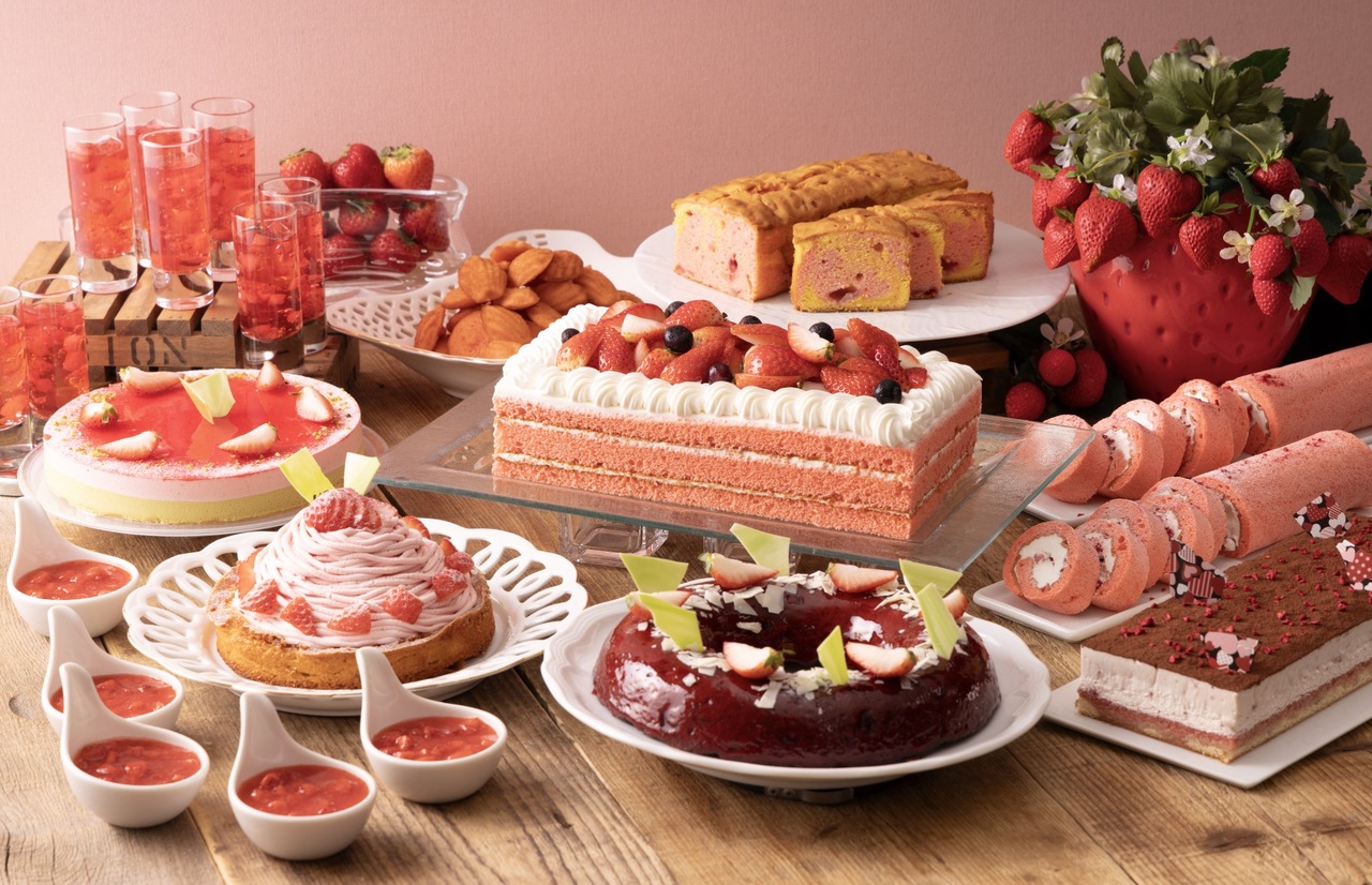【3/15~6/30の期間限定メニュー】いちごのショートケーキ/いちごとピスタチオのムース/いちごのモンブラン/いちごのティラミス/いちごとレモンのパウンドケーキ/いちごとアールグレイのエンゼル/いちごのロールケーキ/いちごミルクのマドレーヌ/いちごサイダーのゼリー/いちごソースの杏仁豆腐/いちごのチョコレートファウンテン