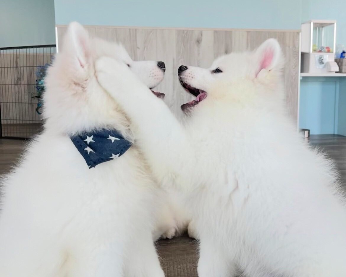 Please note that we cannot be held responsible for any injuries or damage to clothing or personal belongings that may occur while interacting with Samoyeds, so please interact at your own risk.