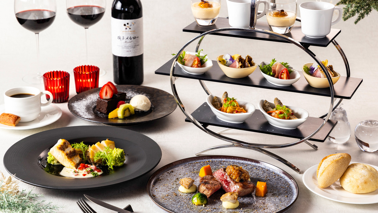 華やかなオードブルスタンドと黒毛和牛、魚料理、デザートなど シェフおすすめコース