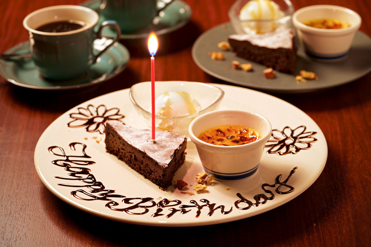シェフオススメのデザート3種にメッセージとロウソクを立ててお祝いしております。