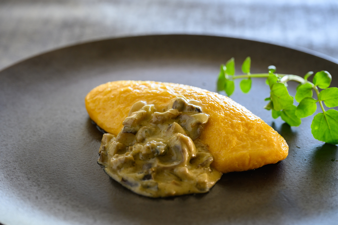 ■Crispy Grilled Ise Chicken Pan-Fried with Mie Prefecture Koshihikari Rice, Smooth Carrot Crema, and a Fragrant Espresso Sauce