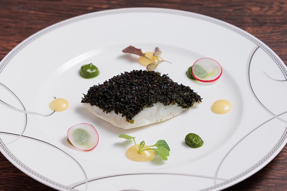 ほんのりとした磯の香りと梅の爽やかさに、レモンを使ったソース〈クーリードシトロン〉を合わせ、軽やかな味わいに仕上げています。