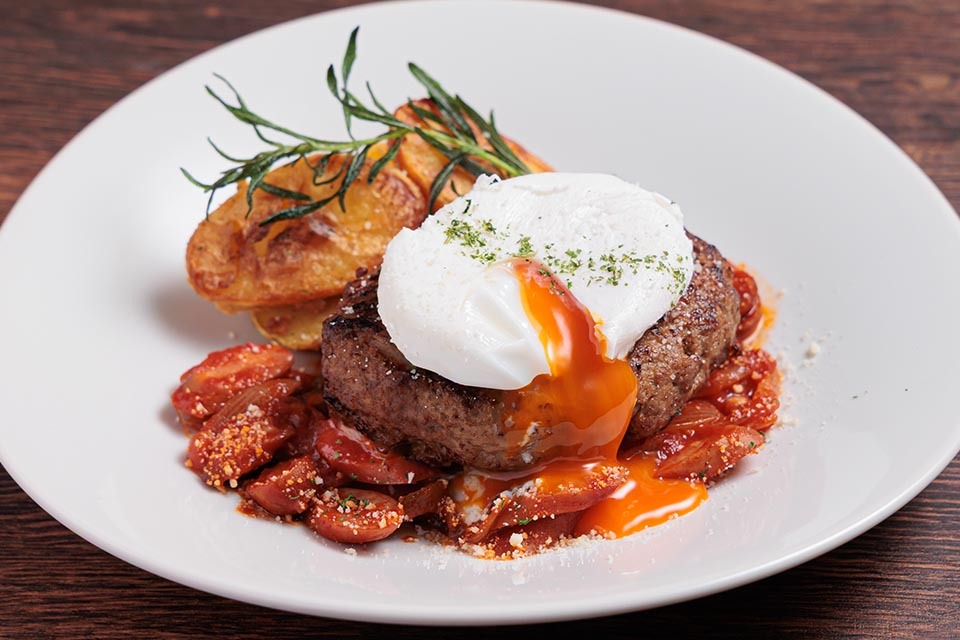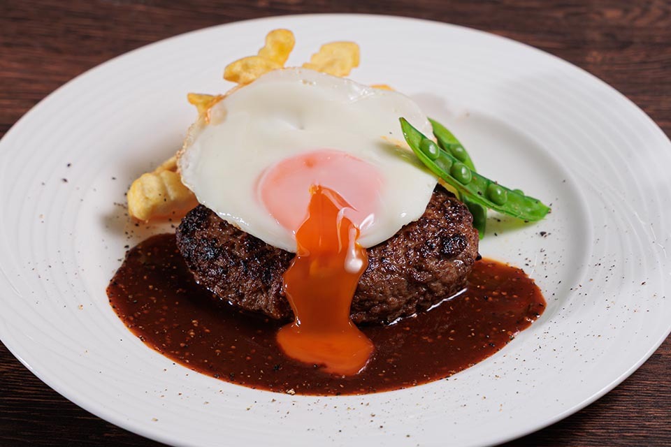 ジューシーに焼き上げたハンバーグステーキに、コクのあるデミグラスソースを合わせました。大阪産卵のフライドエッグを添え、とろける黄味が旨味を引き立てます。