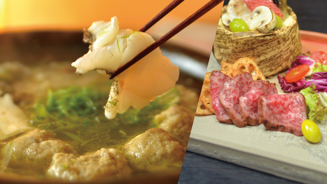 川俣しゃも すき焼き鍋・鮮魚カルパッチョ・佐渡 アカモクうどん・前菜・甘味など